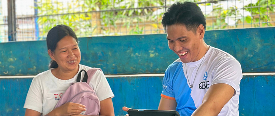 Angeline, 32, smiles as she shares with a QBE volunteer how learning about family preparedness has given her confidence to keep her children safe during disasters. (QBE/Save the Children)